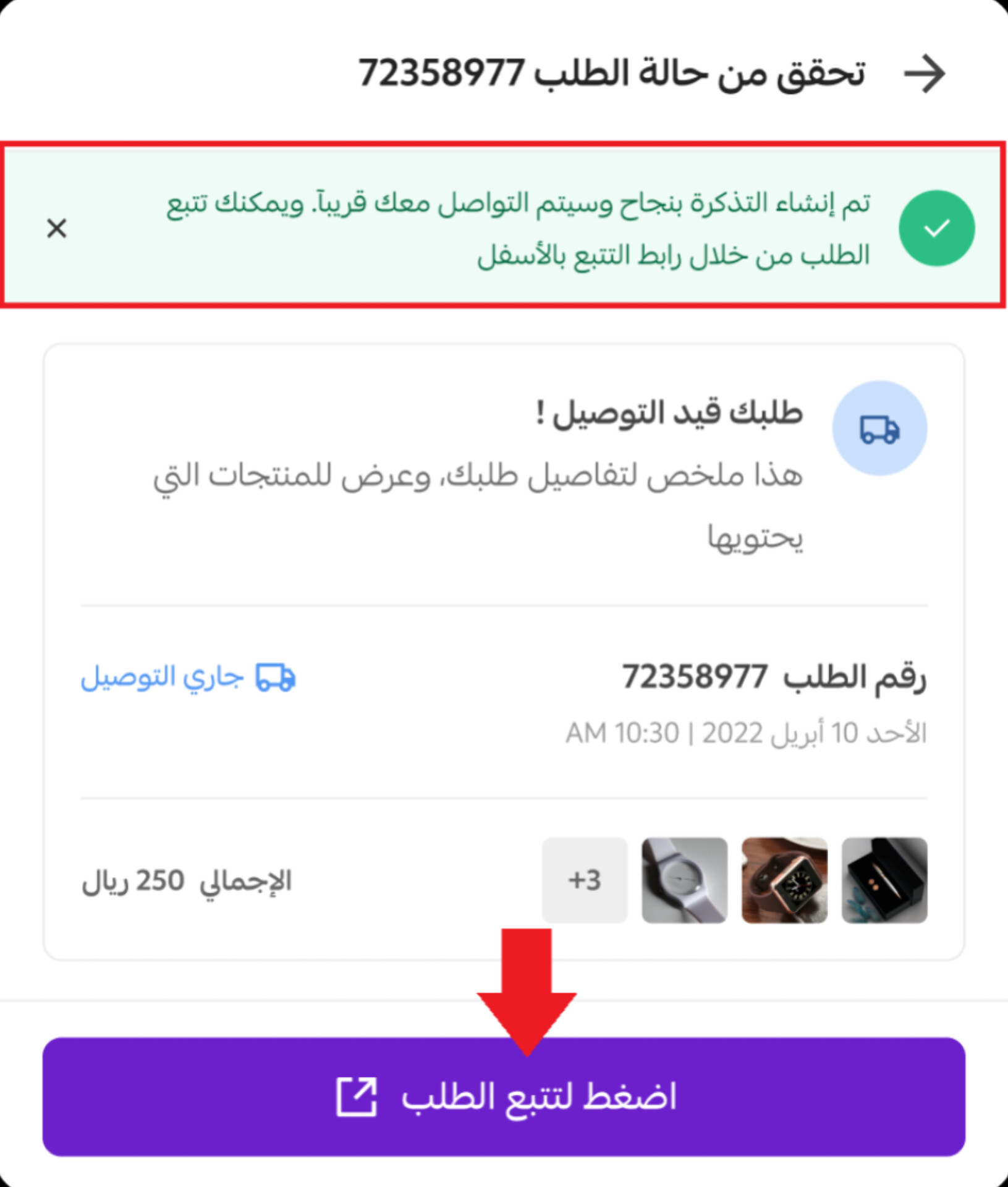 في هذه الحالة، يمكن للعميل تتبع الطلب دون الحاجة لرفع تذكرة، و سيتم إرسال رابط تتبع للعميل مباشرة.
