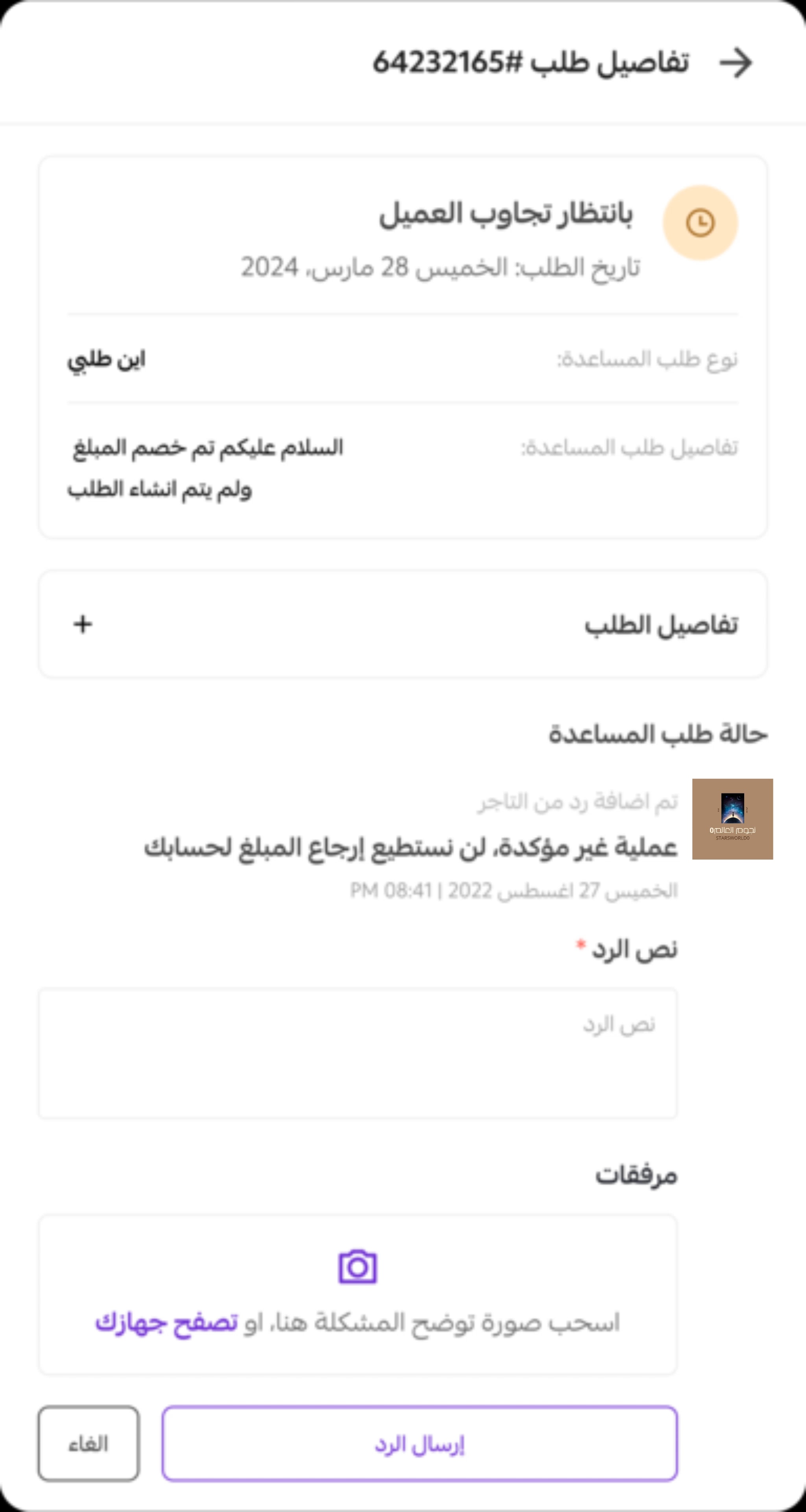 اضغط (رد على التاجر) ، ستظهر له خانة لكتابة تفاصيل التذكرة أو إرفاق صورة تثبت التفاصيل.