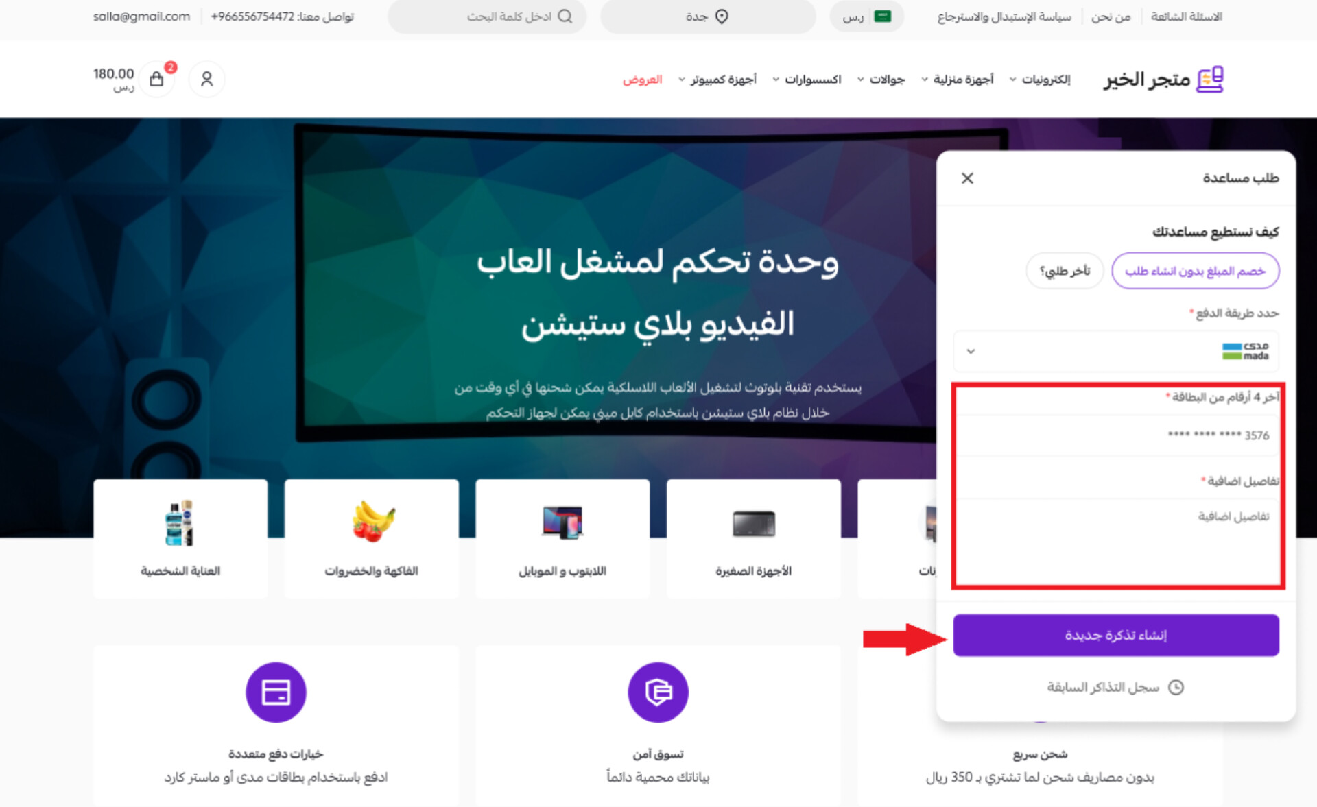 4. أضف آخر 4 أرقام من البطاقة التي تم خصم المبلغ منها، ثم قم بإضافة أي تفاصيل إضافية، و أخيراً اضغط على (إنشاء تذكرة جديدة)
