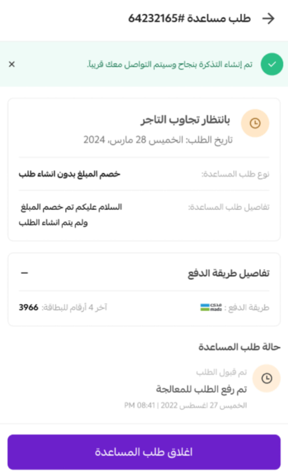 بعد تقديم التذكرة بنجاح، يجب أن تظهر حالة التذكرة (تحت التحقق من التاجر).