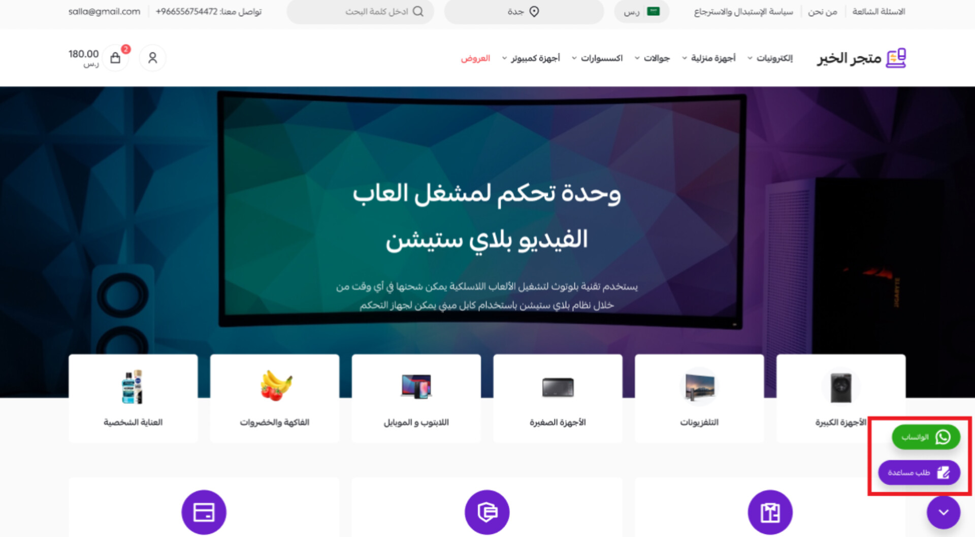 ستظهر أيقونة ثابتة في أسفل يمين الشاشة في جميع متاجر سلة. من خلال هذه الأيقونة، يستطيع العميل التواصل مباشرة عبر الواتساب أو رفع استعلام من خلال نظام التذاكر.