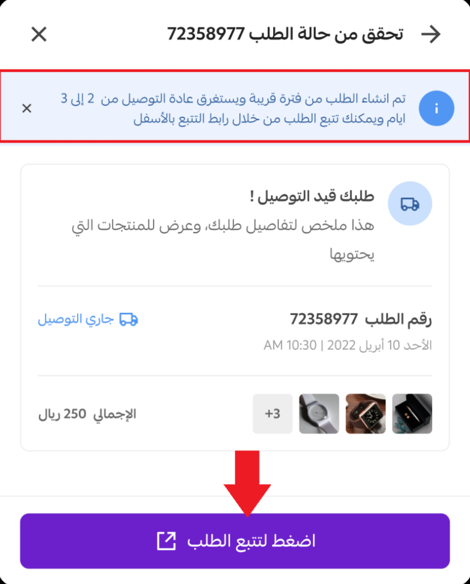 الحالة الأولى: إذا كان الطلب أقل من 48 ساعة وحالته (جاري التوصيل - بانتظار المراجعة - تم تنفيذ)